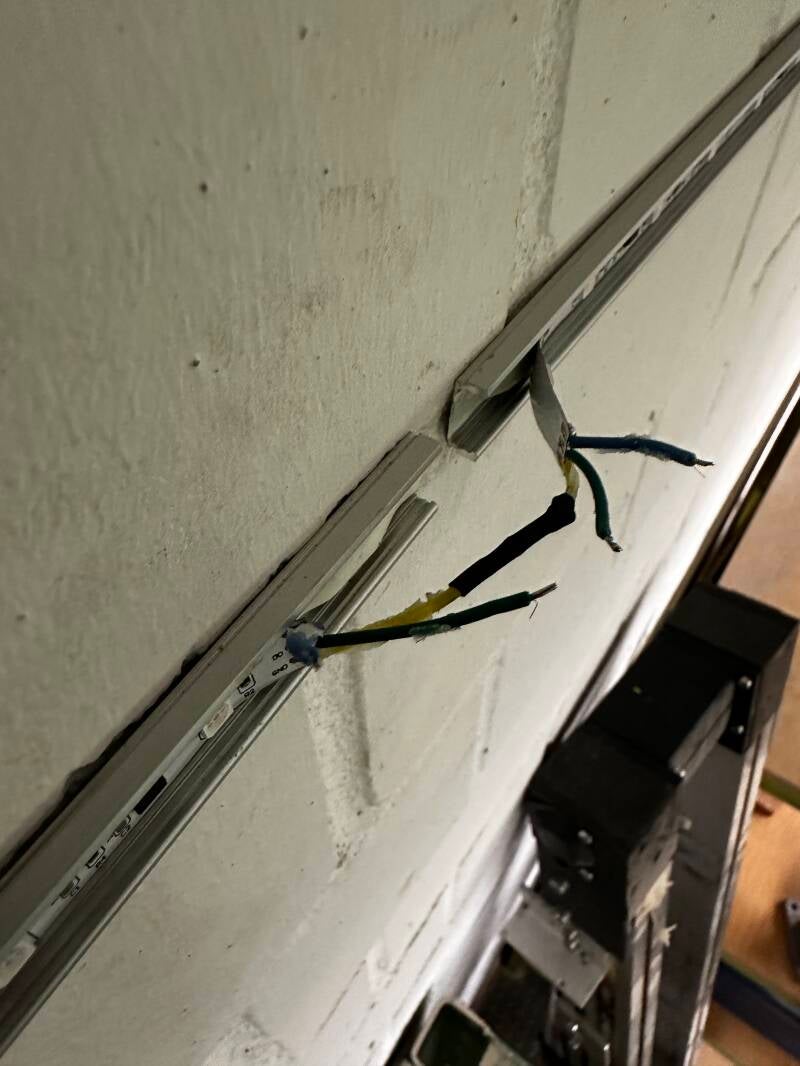 Die LED Bänder wurden an den Aufbauprofilen mithilfe des zuvor angebrachten Klebebandes aufgeklebt. Es stellte sich dabei heraus, dass es Sinnhaft ist, die LED Bänder auf eine entsprechende Länge anzupassen. Damit würde jeder einzelne Schrank über ein eigenes LED Band verfügen. Somit sind leichte Bewegungen bzw. Schwankungen, welche durch das öffnen des Schrankes passieren können kein Problem für die LED Bänder. Ich habe Lötarbeiten durchgeführt um die LED Bänder untereinander zu verbinden.